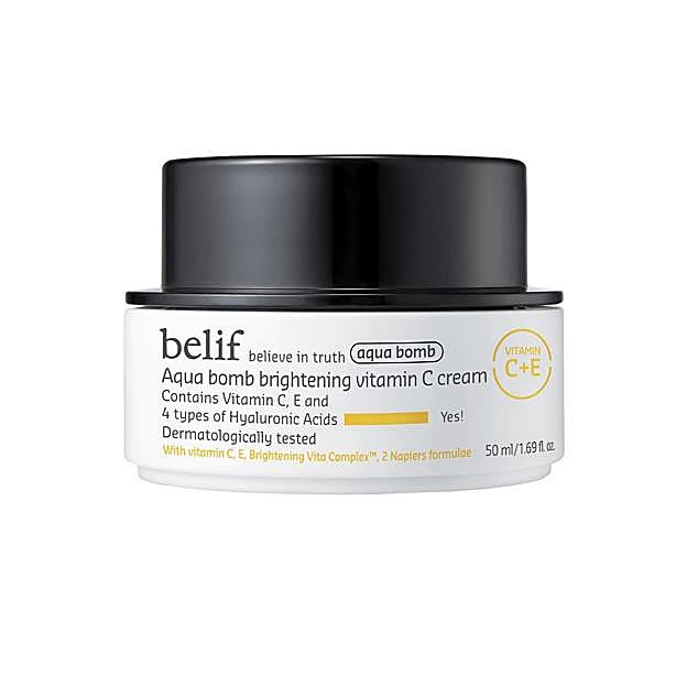 Te proponemos algunos productos con vitamina C que hemos probado y nos gustan por sus efectos en la piel. En primer lugar, la crema Aqua Bomb Brightening de Belif (37,99 euros/50 ml). Es una crema compuesta por vitamina C y 4 tipos de ácido hilaurónico. Es apta para todo tipo de pieles y mejora la textura y la luminosidad del rostro tras cuatro semanas de uso.