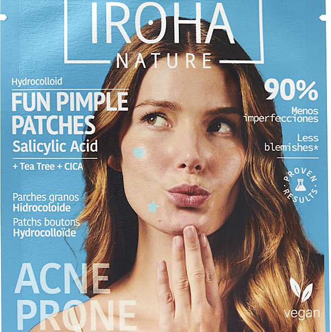 Parches para Granos FUN de Iroha Nature. En forma de corazones y estrellas, son perfectos para aquellos que abrazan su piel real, sin filtros ni complejos. Con su potente fórmula a base de ácido salicílico, árbol de té y centella asiática, estos parches con tecnología hidrocoloide no solo protegen y disminuyen la inflamación, sino que ayudan a eliminar el grano de manera rápida y sin dejar rastro. Precio: 3,95 euros.