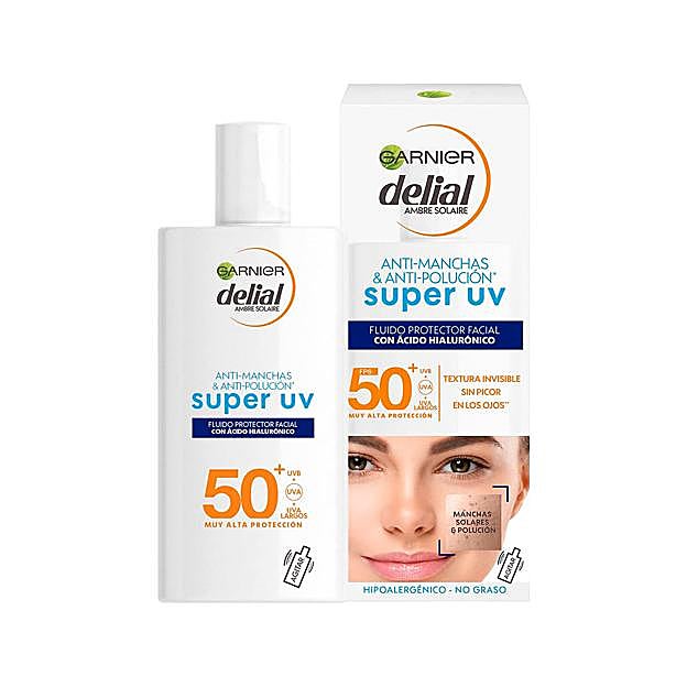 Se trata del protector solar Super UV de Garnier. Cuenta con SPF 50 y además, protege la piel de manchas. La textura es muy fluida, casi invisible y no deja el rostro nada graso. Es una crema solar recomendada para pieles sensibles y está formulado con ácido hialurónico.