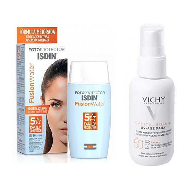 Y es que, si vas a hacerte con un protector del sol para la cara, lo mejor es que lo hagas con uno con efecto invisible. Busca aquellos que tengan texturas invisibles como es el caso del Fusion Water de Isdin (24,30 euros), que es el primer fotoprotector con la innovadora tecnología Fusion Water que al aplicarlo sobre la piel sus filtros UV se transforman en agua logrando una protección invisible y fresca con un acabado mate. También puedes probar con uno en formato bruma como Capital Soleil UV-AGE Daily SPF50+ de Vichy (26,50 euros), con una textura water fluid ultraligera de rápida absorción con un acabado invisible mate sin trazas blancas.