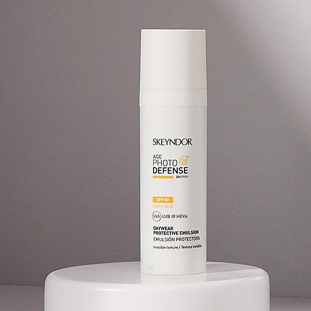Age Photo Defense de Skeyndor es una emulsión protectora facial con protección solar alta SPF50, con textura invisible adaptada a todo tipo de piel y que es ideal para aplicar después de tus cosméticos diarios. Forma parte de una nueva línea de protección solar que combina filtros físicos, químicos y activos biológicos específicos. Además, gracias a la innovadora tecnología [D+] TECH y a una formulación avanzada a base de extracto de achicoria y remolacha, reactiva los receptores de Vitamina D (VDR) sobre la piel, compensando su déficit sin comprometer la protección solar.