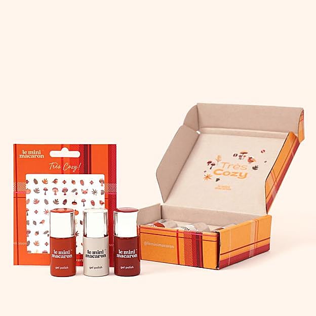 Tienes el set Très Cozy - Trío de Esmaltes de Le Mini Macaron que incluye tres tonos de esmaltes semipermanentes (un intenso naranja canela, un rojo cálido y tostado y un blanco roto cremoso) y mini pegatinas para uñas adorables. Cuesta 38 euros.