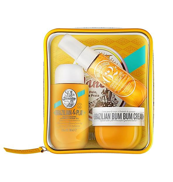 Bum Bum Jet Set de Sol de Janeiro es un set con los productos de culto en formato mini: la legendaria crema corporal Bum Bum, el gel de ducha en crema Brazilian 4 Play y la bruma perfumada Brazilian Crush, para pulverizar de pies a cabeza y saborear sus embriagadoras notas de pistacho y caramelo salado. Una delicia para el cuerpo, irresistible y siempre a tu lado.