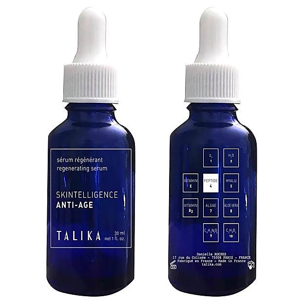 Y, el Skintelligence Anti-Age Regenerating Serum de Talika. Este producto devuelve la piel a la juventud con sus propiedades reparadoras totales. Formulado con una innovadora mezcla de péptidos que contribuyen a la síntesis del colágeno, lo potencian y así, reafirman y alisan arrugas. Por otra parte, el ácido hialurónico hidrata en profundidad, rellena y tersa. Los prebióticos de microalgas hacen el cutis más resistente, revitalizan el aspecto opaco, palian la deshidratación y favorecen la renovación celular. La niacinamida y el aloe vera despliegan sus propiedades antiinflamatorias, igualan tono y textura y, corrigen manchas e iluminan junto a la mezcla de polisacáridos antioxidantes. Por último, ácido láctico, adenosina, vitamina E y manteca de karité cubren eficazmente al resto de activos para resultados de 10.