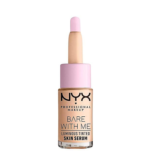 O, dentro de la gama low cost, el Makeup Bare With Me Luminous Tinted Skin Serum de NYX, que unifica el tono, reduce la apariencia de manchas, suaviza arrugas y deja un brillo rocío muy saludable en la tez, mediante ingredientes iluminadores como el hongo tremella y los aceites hidratantes como el de jojoba. Muy ligero y natural, lo puedes encontrar en 5 tonos y a un coste de 14,95 euros.
