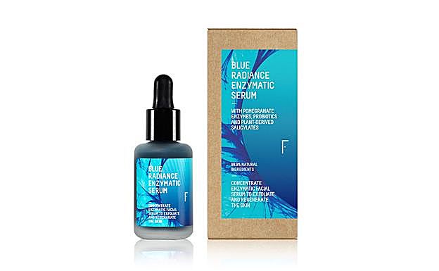Como veis en la imagen, se trata del Blue Radiance Enzymatic Serum de Freshly Cosmetics, que no sólo exfolia la piel de tu rostro, sino que además rejuvenece, reduce y trata arrugas, acné y puntos negros, minimiza los poros y imperfecciones y elimina el enrojecimiento. Se trata de una alternativa a los conocidos exfoliantes ácidos AHA y BHA que no irrita y suaviza la piel gracias a potentes activos como enzimas de papaya y granada, probiotic lactococcus, caviar de lima australiano, salicilatos de la corteza del sauce negro, baicalina vegetal, gardenia blue, alternativas vegetales a los retinoides y ácido hialurónico marino vegano.