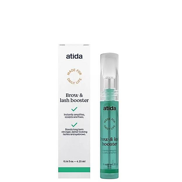 El potente sérum Brow & Lash Booster de Atida supone un impulso eficaz a las pestañas y cejas debilitadas y despobladas. Es capaz amplificar, esculpir y fijar al instante, a la vez que trabaja a largo plazo para reforzar, evitar la caída, alargar, voluminizar e intensificar el tono. Esta fórmula revitalizante se basa en una combinación única de ingredientes acondicionadores y estimuladores del crecimiento.
