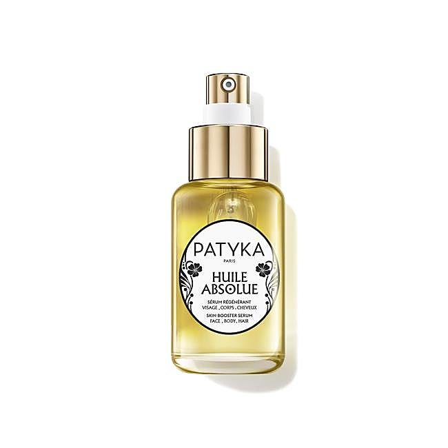 Huile Absolue de Patyka contiene 12 aceites vegetales y esenciales que actúa como una auténtica cura de emergencia tras los excesos del verano reconfortando la piel de rostro y cuerpo, y devolviendo la vitalidad a las puntas secas del cabello. Sobre la piel del rostro, aporta tonicidad, luminosidad y nutrición. Precio: 51,90 euros.