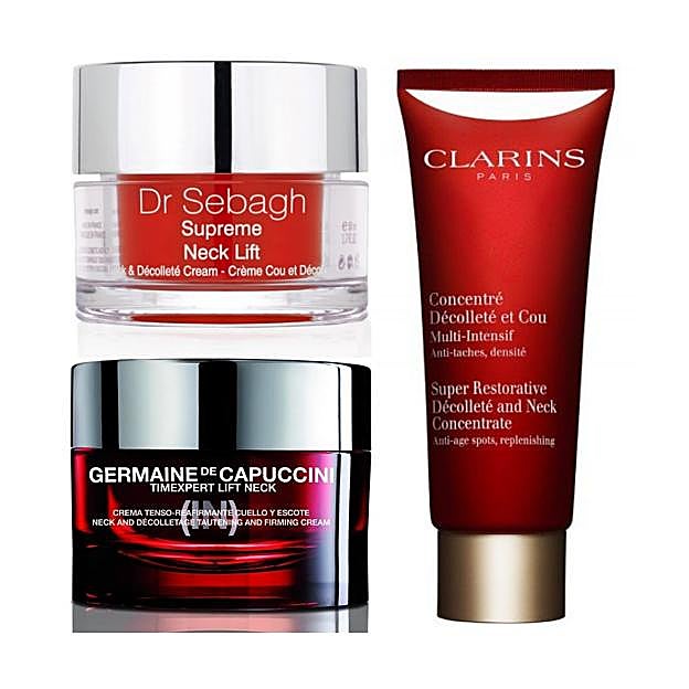La primera de ellas es Supreme Neck Lif de Dr. Sebagh, que devuelve la firmeza y la elasticidad en tan solo dos semanas gracias a su alta concetración de de ingredientes ctivos y su acción reafirmante y tensora (155 euros). También puedes recurrir al tratamiento de Germaine de Capuccini. que en solo tres semanas ciñe y reajusta la piel distendida del cuello y la matriz de soporte se refuerza y la frágil epidermis de cuello y escote se rejuvenece (59,90 euros). Por último, está la Multi Intensiva Cuello y Escote de Clarins, un concentrado de activos, agradable y no graso, realza la textura y la calidad de la piel gracias a las propiedades redensificantes, unificantes y embellecedoras de sus extractos vegetales (53,40 euros).