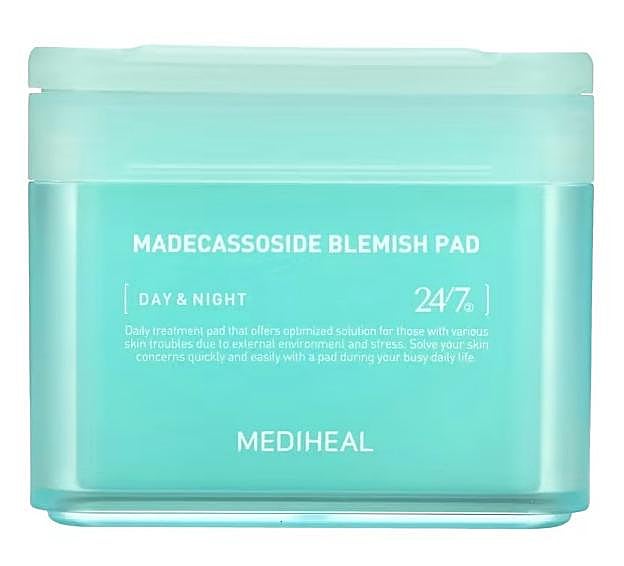 Madecassoside Blemish Pad de Mediheal. Estos tónicos en formato pad están formulados con Madecassoside y Centella Asiática, dos ingredientes conocidos por sus propiedades calmantes y reparadoras. Juntos, forman el complejo CalmingTox, que no solo reduce visiblemente las imperfecciones, sino que también alivia la piel irritada y promueve una mejoría en el tono general del rostro. Utilizan un sistema de administración de liposomas para asegurar que los activos lleguen a las capas más profundas de la piel. Esto se traduce en una piel más uniforme, libre de rojeces e imperfecciones, y con un aspecto saludable que se mantiene durante todo el día. Precio: 27,90 euros en Planet Skin.