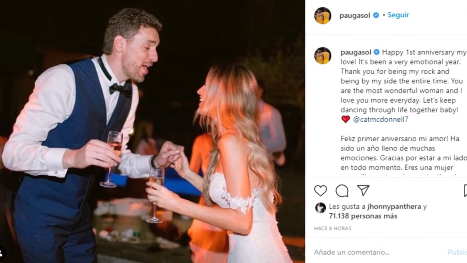 Hoy estamos de aniversario, Pau Gasol y su mujer, Catherine McDonnell celebran su primer aniversario de boda juntos. La pareja pregonaba su amor a los cuatro vientos en San Francisco, con una ceremonia de lo más romántica.(Fuente: Europa Press/Instagram)