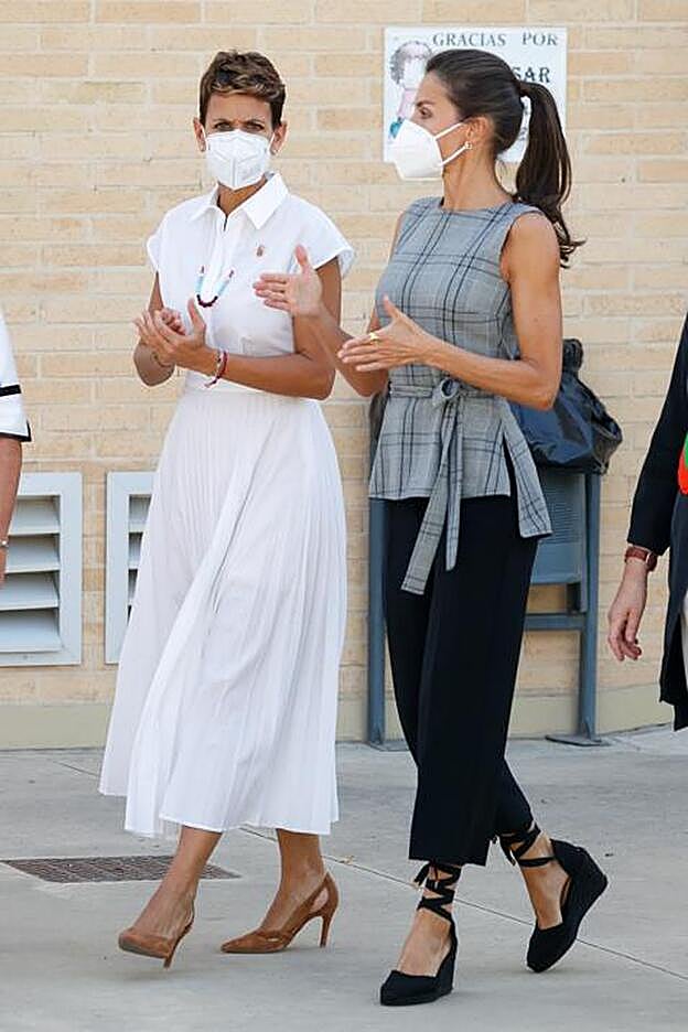 Arranca oficialmente el curso escolar (aunque la Princesa Leonor lo inició la semana pasada) y, como es ya tradición, la Reina ha sido la encarga de inaugurarlo. En esta ocasión, ha sido en Navarra, en el Colegio Público de Educación Infantil y Primaria Nuestra Señora del Patrocinio y en el Instituto de Educación Secundaria EGA, de las localidades de Milagro y de San Adrián, y allí hemos visto cómo doña Letizia aparecía con un look muy sencillo y favorecedor que, además, confirmaba dos cosas: por un lado, que continúa la estrategia de austeridad ‘sartorial’ que inició la Reina al comienzo de la crisis del Coronavirus, y que los cuadros son su estampado favorito para el entretiempo.