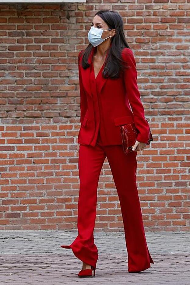 En esta ocasión, la Reina se ha puesto las tendencias por bandera, literalemente, y ha apostado todo al rojo con un conjunto 'made in Spain' que le sienta de maravilla: su traje de Roberto Torretta que estrenó en Valladolid hace un par de años, y que se ha vuelto a poner en otras dos ocasiones (en una visita oficial a Bélgica y en un viaje a Cáceres). El dos piezas está formado por una original chaqueta entallada de doble solapa que hace efecto chaleco y le permite no llevar top ni blusa, y un favorecedor pantalón de silueta 'flare' con abertura en el bajo, un detalle que empezamos a ver a Victoria Beckham la temporada pasada y que, poco a poco, se ha ido asentado en el 'street style'.