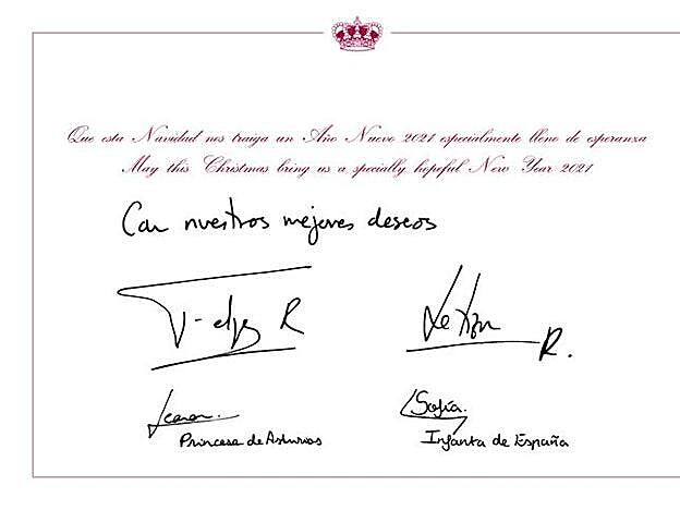 Diferencias también encontramos en el mensaje que envían. Mientras que don Felipe y doña Letizia mandan (en castellano e inglés) "nuestros mejores deseos" para "que esta Navidad nos traiga un Año Nuevo 2021 especialmente lleno de esperanza" y firman a mano, junto a Leonor y Sofía, la postal navideña; según se ha filtrado en diferentes portales británicos, Kate y Guillermo dedican sus palabras "a todo el increíble personal del servicio nacional de salud (NHS por sus siglas en inglés). Les deseamos una muy feliz Navidad y año nuevo", a quienes aseguran "nunca podremos agradeceros lo suficiente la dedicación y el sacrificio que habéis hecho este año. Siempre estaremos agradecidos".