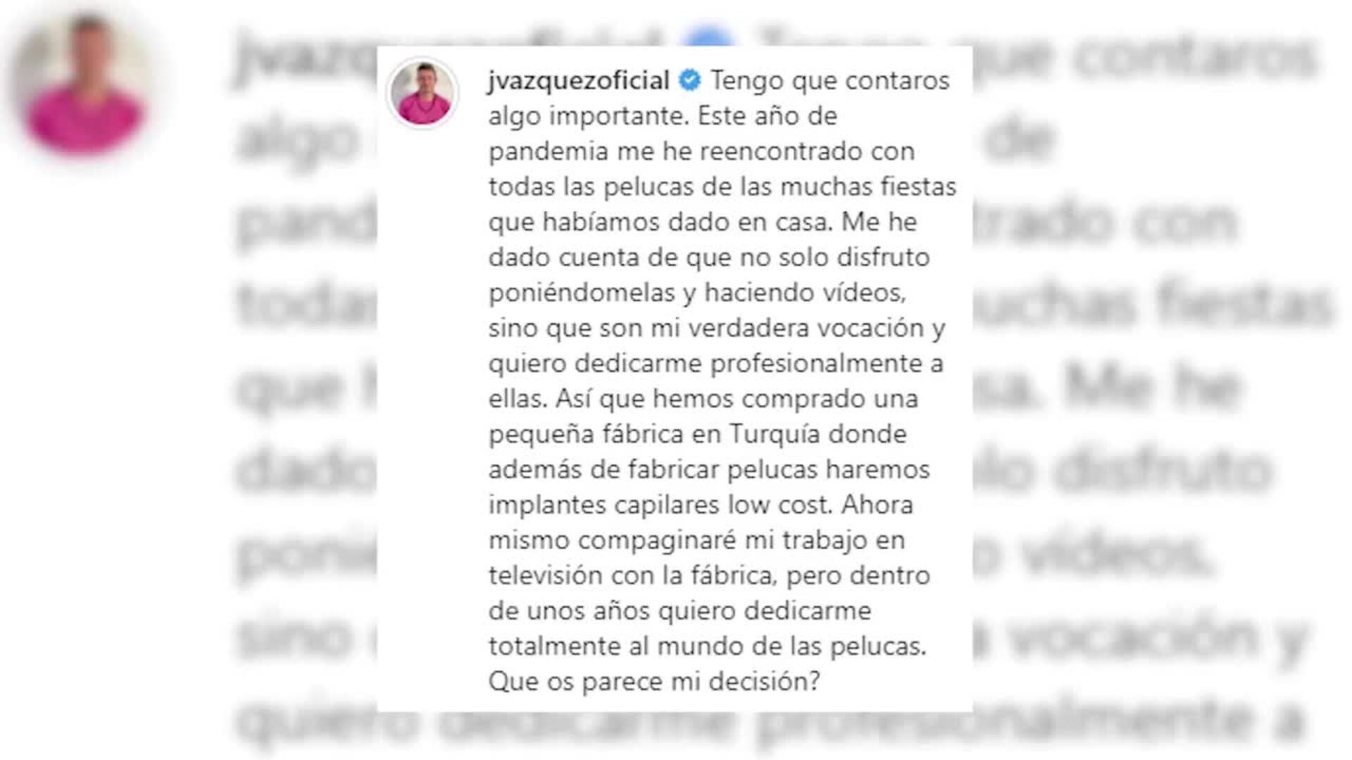Jesús Vázquez ya había celebrado la Navidad con sus seguidores a través de una serie de vídeos junto a su marido, Roberto Cortés, unas imágenes de lo más divertidas con las que ambos han conseguido sacarnos una sonrisa en este año tan complicado. Y aprovechando el gancho de esos divertidos vídeos, el presentador ha sorprendido a sus fans con una noticia de lo más misteriosa. Y es que Jesús Vázquez ha escrito en su perfil de Instagram que las pelucas son su "verdadera vocación". "Hemos comprado una pequeña fábrica en Turquía donde además de fabricar pelucas haremos implantes capilares low cost", confesaba el presentador, que con esto y con motivo del dia de los santos inocentes parece gastar una broma a todos sus seguidores.(Fuente: Europa Press/Instagram)