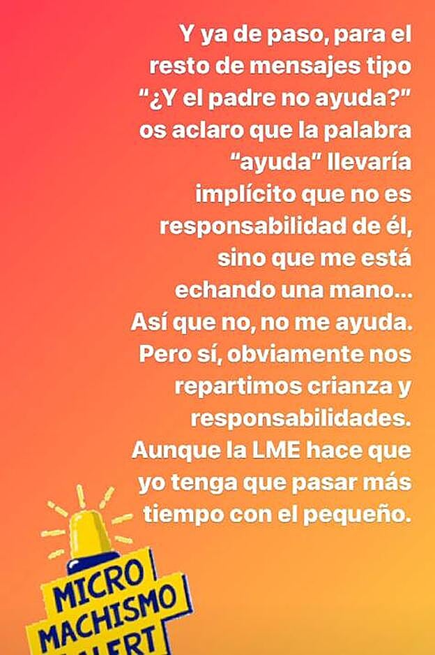 “Y ya de paso, para el resto de mensajes tipo ¿Y el padre no ayuda?, os aclaro que la palabra ayuda llevaría implícito que no es responsabilidad de él, sino que me está echando una mano... Así que no, no me ayuda. Pero sí, obviamente nos repartimos crianza y responsabilidades”, dijo en sus stories de Instagram y no lo pudo dejar más claro. ¿Cuántas veces deben aguantar las madres que a los padres se les tilde de padrazos por hacer sólo lo que tienen que hacer y a ellas las juzguen sin piedad por cualquier detalle ínfimo? Las distintas varas de medir en cuanto a la crianza, es lo que ha querido resaltar la actriz con su publicación en Instagram.