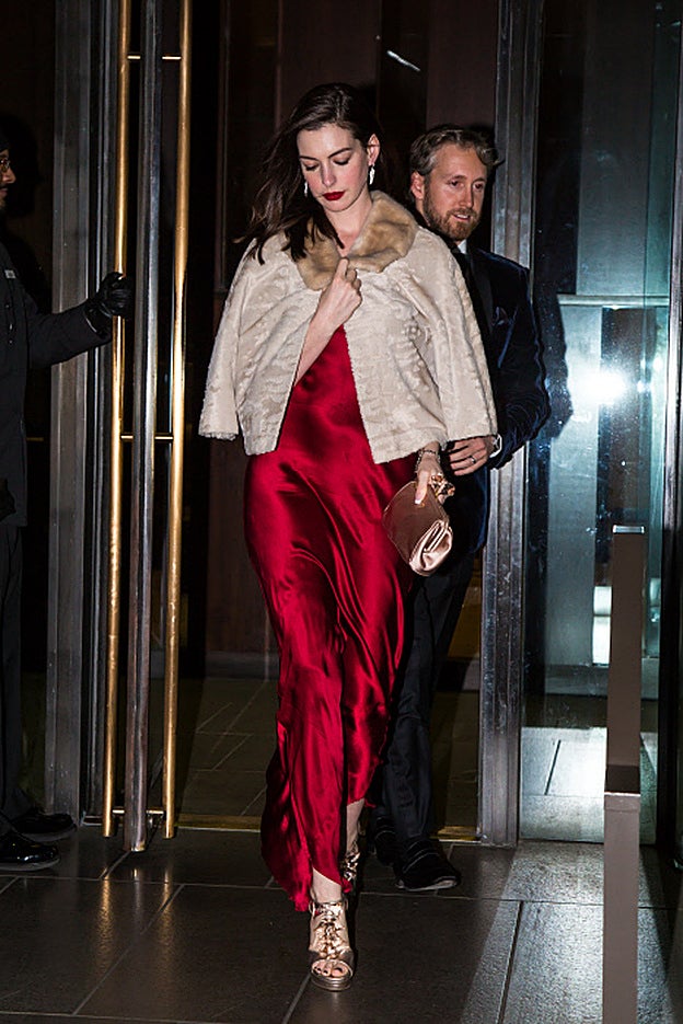 Anna Hathaway ha sido la última en sumarse a esta tendencia con un vestido bastante más recatado que el de Rihanna y Bella. De tirantes y completamente liso, lo combinó con una estola beige y unas sandalias joyas dorada para asistir a una cena en el restaurante francés Le cirque, uno de los más lujosos de Nueva York. Además su marido Adam Shulman, quienes tampoco quisieron perderse la fiesta de cumpleaños fueron Olivia Palermo y su marido Johannes Huebl y Valentino.