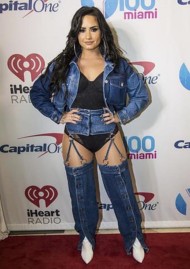 La cantante se ha enfundado un dos (¿tres?) piezas en denim indigo lavado con chaqueta corta (lo mejorcito del look) y una especie de jeans 'cut out' en los que la parte de la cinturilla se une a las perneras (abotonadas, al más puro estilo chándal de los 2000) con un liguero. Por si todo esto no fuera suficiente, Demi Lovato lo ha combinado con un body negro lencero, botas blancas y maxi aros.