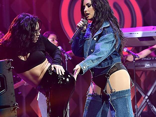 El look de Demi Lovato es una oda a lo peorcito de la moda de comienzos de los 2000, un 'revival' trasnochado de los looks de Christina Aguilera, Paris Hilton y Alicia Keys sus 'low rise jeans', un 'déjà vu' de aquel crimen de moda que cometieron Britney Spears y Justin Timberlake en los American Music Awards de 2001. El feísmo extremo y con tintes de otra época.