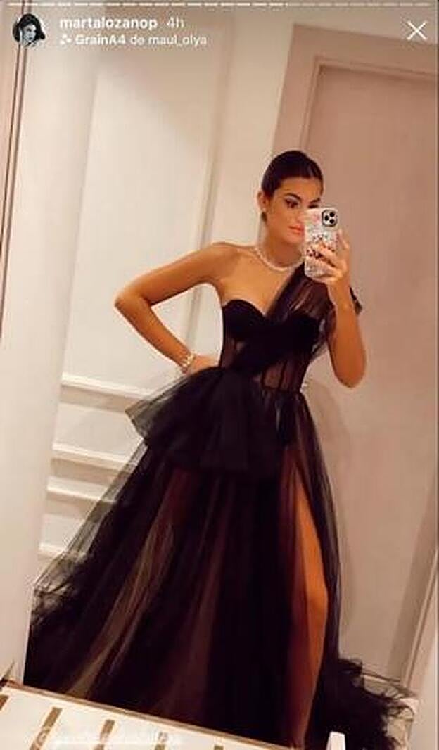 Carla Hinojosa ha escogido uno de los colores de la noche, el blanco, con un vestido de encaje y tul de Inmaculada Garcia y Laddy Addcit un diseño ajustado de terciopelo de los más favorecedor.