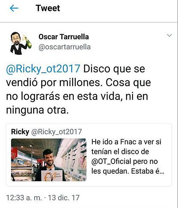 La broma no sentó bien a Óscar Tarruella, representante y marido de la cantante, que respondió al triunfito con un mensaje bastante duro. Minutos después se arrepintió y borró su tuit, aunque ya era demasiado tarde. Muchos tuiteros habían hecho un pantallazo a sus palabras: “Disco que se vendió por millones. Cosa que no lograrás en esta vida, ni en ninguna otra”.