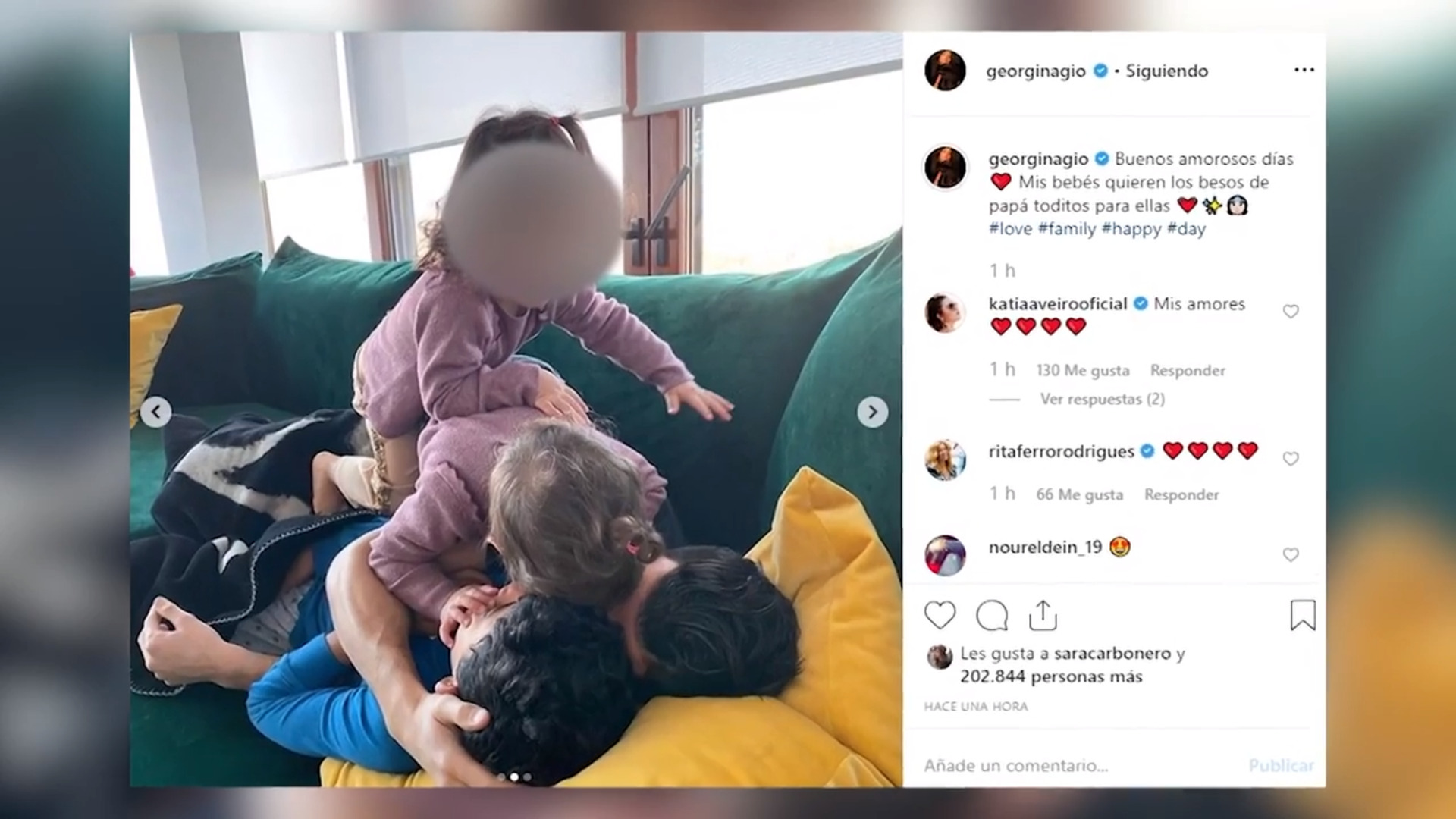 Georgina Rodríguez disfruta de una mañana familiar. La influencer ha colgado unas fotografías con los pequeños de la casa. En ellas, se puede ver a Cristiano Ronaldo pasándolo bien junto con sus hijos en una imagen de lo más hogareña. “Buenos amorosos días- ¿Mis bebés quieren los besos de papá toditos para ellas? escribió la modelo muy contenta en una publicación en su perfil de Instagram.