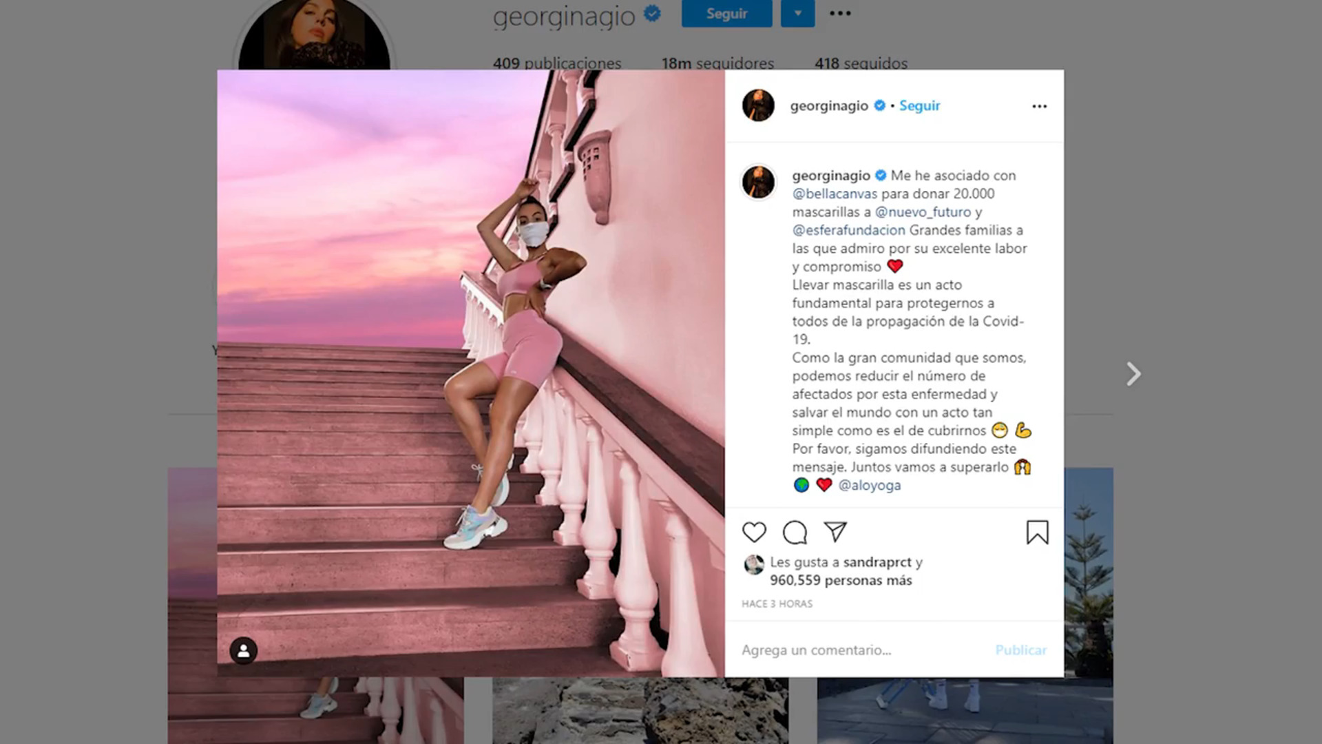 Georgina ha querido sumarse a la lista de famosos que han colaborado para luchar contra la Covid-19. La modelo, ha decidido asociarse con Bella Canvas, una empresa que ahora se dedica a la elaboración de mascarillas, para donar 20.000 mascarillas a la asociación Nuevo Futuro, que lucha por los derechos de los niños, y la Fundación Esfera, que trabaja con personas con discapacidad intelectual.