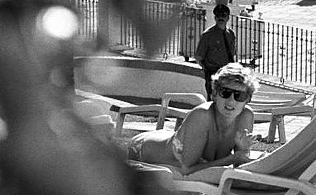 Mayo de 1994. Lady Diana Spencer, recién separada del Príncipe Carlos de Inglaterra, decide pasar unos días de vacaciones en la Costa del Sol y se aloja con dos amigas en el Hotel Byblos, muy popular entre la Jet, que abre de nuevo sus puertas tras diez años cerrado. Al día siguiente, la noticia ya se había filtrado y decenas de fotógrafos y varias unidades móviles colapsaban la entrada del Byblos. En la piscina había más «paparazzi» que clientes. La foto llegó al tercer día: Diana se abrió la toalla para tumbarse boca abajo pero no llevaba la parte de arriba del biquini. En una ráfaga de 22 instantáneas, el fotógrafo Diego Arrabal, escondido entre unos arbustos, captó a la princesa con los pechos desnudos. El precio que se negoció 200 millones de pesetas en exclusiva mundial; la mitad si sólo era nacional. Las fotos y los negativos permanecían en una caja fuerte de Madrid.