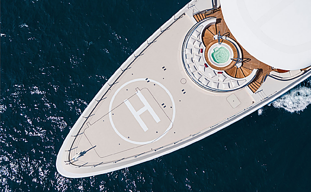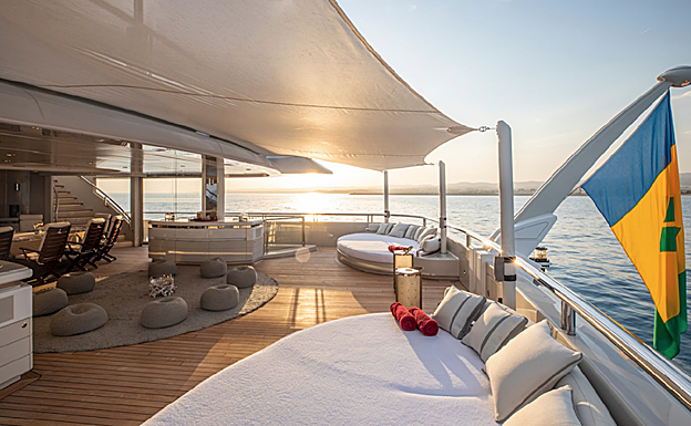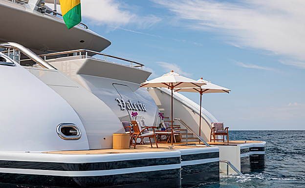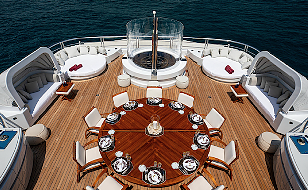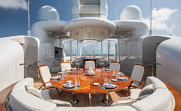 La amplia cubierta delantera del yate 'Valerie', con un helipuerto táctil lo suficientemente grande como para aterrizar un Eurocopter EC130 o Bell 407, tiene espacio para otra piscina y un semicírculo de sombrillas. Además, esta cubierta también puede funcionar como campo de prácticas de golf. En lugar de un comedor formal sofocante en el interior, el propietario especificó un comedor al aire libre en la terraza principal, para 14 personas sentadas alrededor de la mesa ovalada con incrustaciones y barniz de espejo, y vistas panorámicas sobre la cubierta de popa.