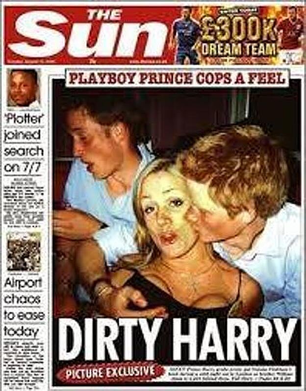'Harry el sucio" fue el titular que empleó The Sun en 2006 junto a la imagen del príncipe tocándole el pecho a una joven en una discoteca de Londres. Tras él, aparecía el prícnipe Guillermo hablando con otra joven. Tras esa portada, la familia real británica aseguró que la foto no era actual, sino que fue tomada tres años antes.