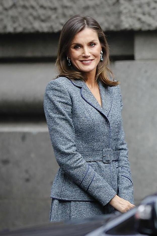 La Reina sabía que hoy no era la protagonista, pero que sí que se estudiaría cada uno de sus gestos y, como siempre, los detalles de su look. Por eso, doña Letizia ha apostado sobre seguro confiando en su diseñador de cabecera, el que la viste en sus momentos más importantes, y para acertar aún más, se ha decantado por el dos piezas de inspiración ‘new look’ en cheviot gris bordado a mano en hilo, con chaqueta entallada con cinturón y falda ‘lady’ con detalles en azul que estrenó en 2017 en el desfile de la Fiesta Nacional.