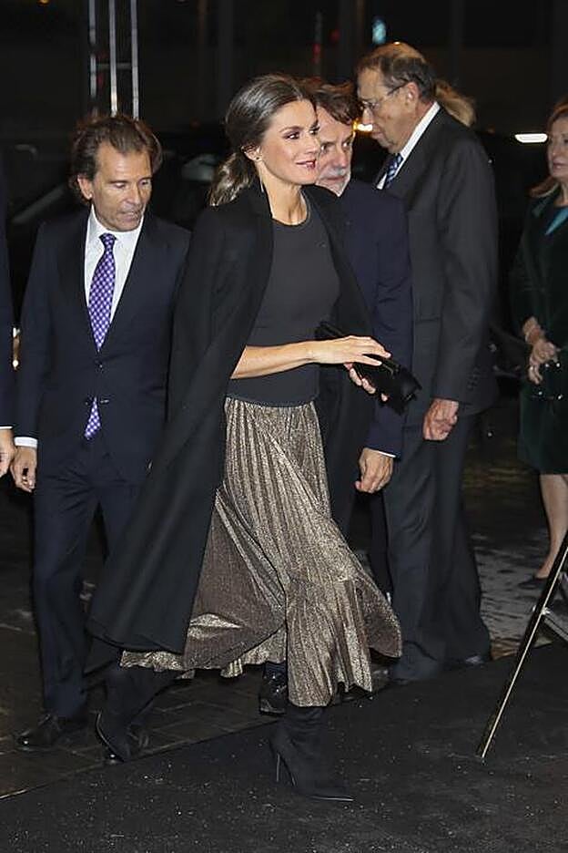 De negro y con un punto 'brilli brilli' sensacional, doña Letizia estrenó una de las faldas que ya anticipamos hace unos días que sería uno de los 'hits' de la nueva colección de Zara: un modelo midi plisado en color dorado con acabado 'glitter' que cuesta 59.95 euros y que, aunque forma parte de la nueva campaña otoño-invierno de la firma de Inditex, ahora mismo no está disponible en la Web.