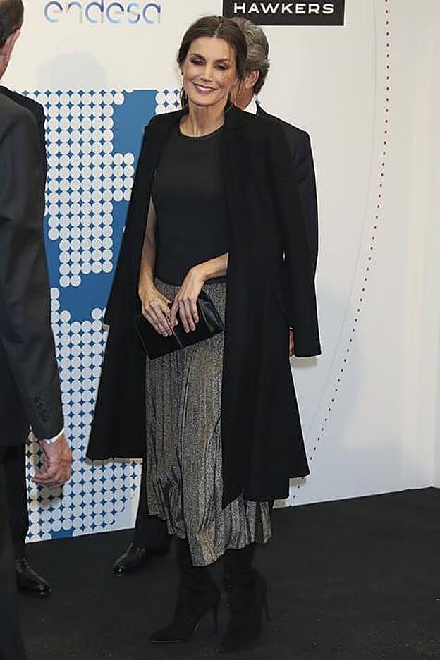Como en la imagen del 'lookbook' de Zara, Letizia también ha apostado por el negro para combinar su falda 'glitter', dejando todo el protagonismo a esta pieza. Un suéter con cuello redondo y un abrigo de Felipe Varela estratégicamente colocado por los hombros (creando un efecto capa, como en la propuesta de la campaña de Inditex) completaban su look, aunque los complementos fueron clave para poner la guinda a su estilismo de noche: clutch de Nina Ricci, botas 'over the knee' de Magrit (las tiene igual en rojo) y pendientes con un toque 'rockero' de Gold&Roses.