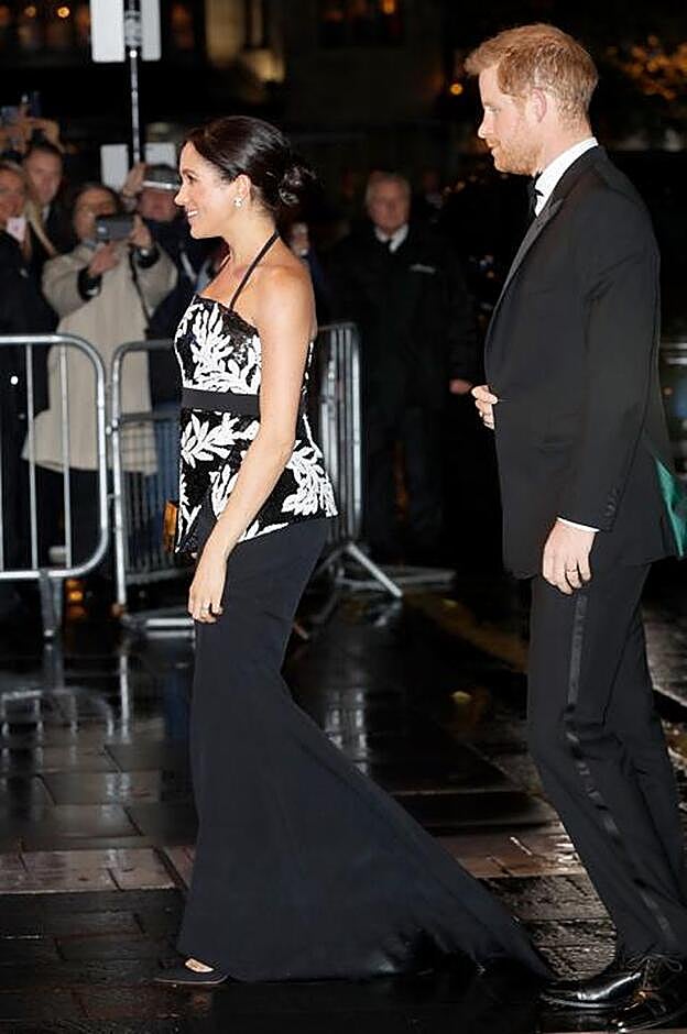 La Duquesa de Sussex ha apostado por un dos piezas 'black&white' de Safiyaa con un imponente top joya con bordados florales en lentejuelas y escote 'halter' que ha combinado con una sencilla falda larga y complementos 'glitter' también en negro.