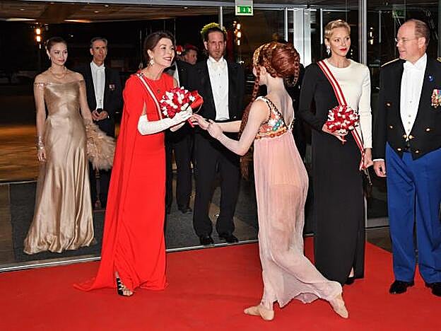 La Princesa de Mónaco se ha vestido de Reina (y de 'celebrity' en la alfombra roja, porque en los Oscars de 2017 Karlie Kloss llevó el mismo vestido en blanco), y con este impresionante look ha sido capaz de eclipsar a su cuñada Charlene, muy sofisticada con look 'black&white', y a su nuera, Beatrice Borromeo, elegantísima en color champagne.