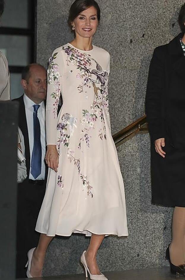 La Reina ha querido hacer un guiño de estilo a China, y se ha decantado por un delicado vestido midi en gasa nude con un maravilloso bordado que nos recuerda a las pinturas y grabados de la porcelana típica del país oriental.