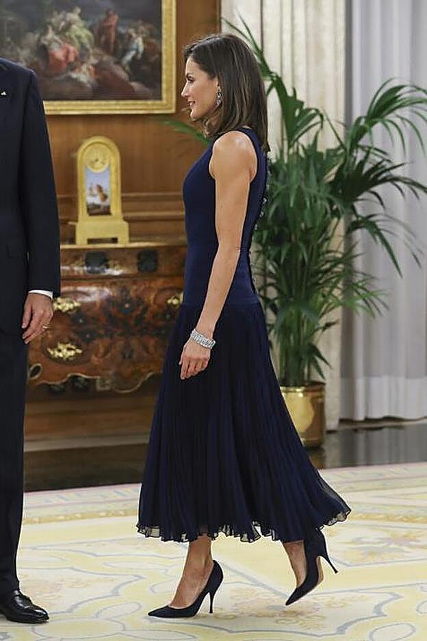 Para asistir a la cena de bienvenida oficial en el Palacio de la Zarzuela, la Reina ha apostado por un vestido midi azul noche de silueta bailarina con botones joya a la espalda. Doña Letizia estrenó este diseño de cuerpo entallado y falda de gasa plisada firmado por Felipe Varela hace algo más de un año, en el concierto previo a los Premios Princesa de Asturias 2017 y, como entonces, vuelve a resaltar la excelente figura de la que puede presumir.