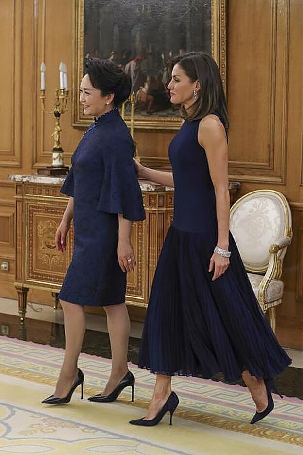 La esperada visita del Presidente de China y su mujer a España ya nos ha dejado el primer look de noche de la Reina Letizia que, muy coordinada con la Primera Dama visitante, ha vuelto a ejercer de perfecta anfitriona recuperando uno de los vestidos que mejor le sienta de su armario.