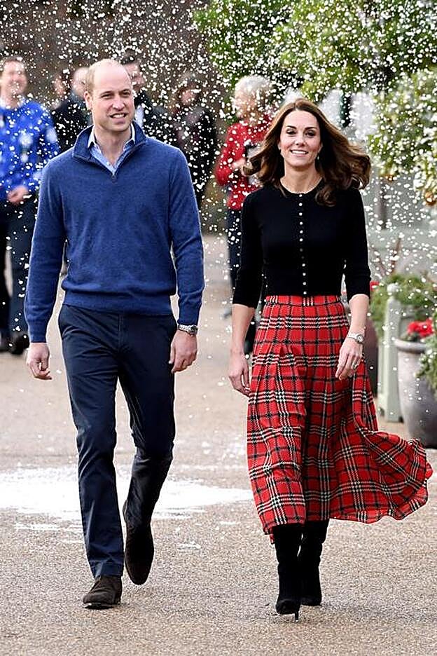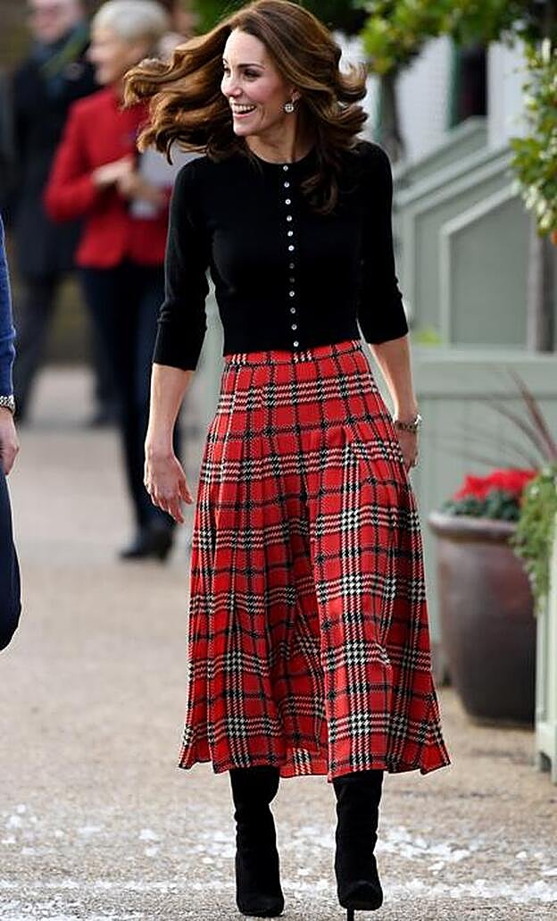 El rojo es el color de las Fiestas, y Kate Middelton lo ha utilizado de la mejor manera posible para crear la mejor versión de estilo de la Navidad perfecto. La Duquesa de Cambridge ha cedido todo el protagonismo de su look a esta maravillosa falda midi de tablas con estampado tartán de Emilia Wickstead, que ha combinado con una sencilla rebeca negra entallada y unas botas (¿serán 'over the knee' como las de la Reina Letizia?) a juego.