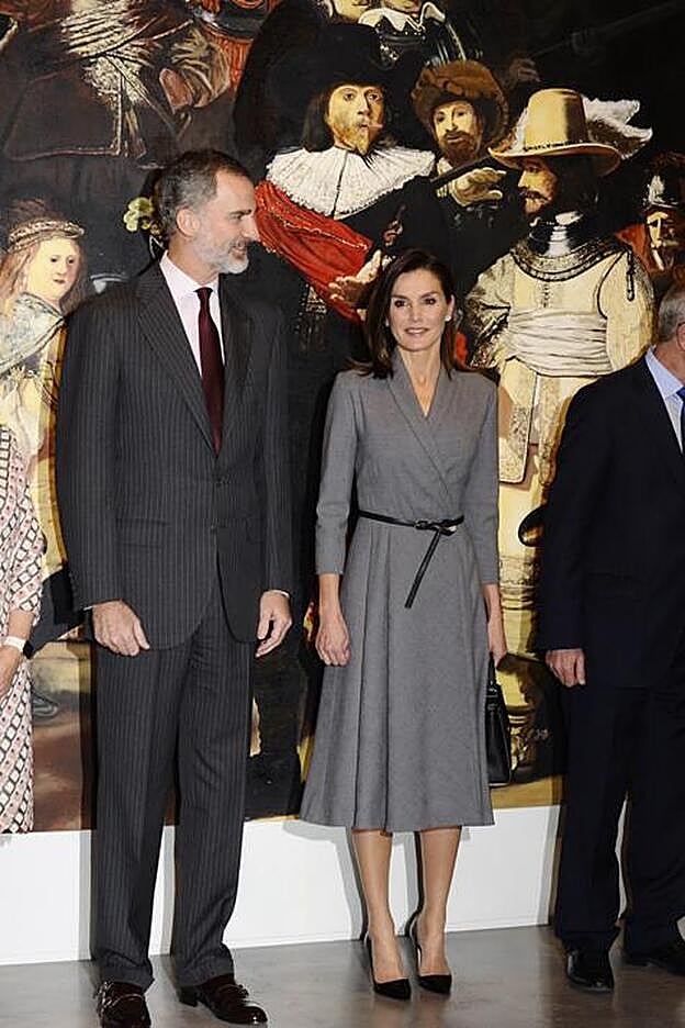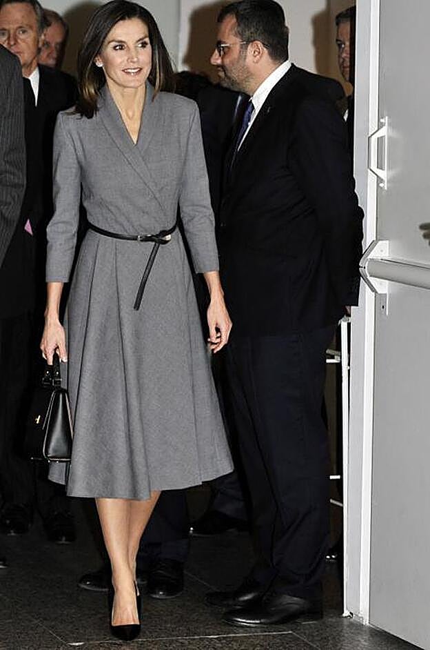 Para presidir la inauguración de la exposición 'Poéticas de la democracia. Imágenes y contraimágenes de la Transición' en el Museo Reina Sofía de Madrid, doña Letizia ha estrenado un ‘wrap dress’ gris con cuello esmoquin y silueta ‘new look’ que le sentaba como un guante, ya que estiliza la figura marcando la cintura, alarga el torso con su escote en uve cruzado y, además, disimula el volumen de las caderas (en caso de necesidad) con su falda ‘lady’ de largo midi.