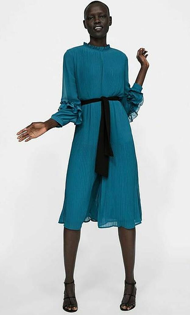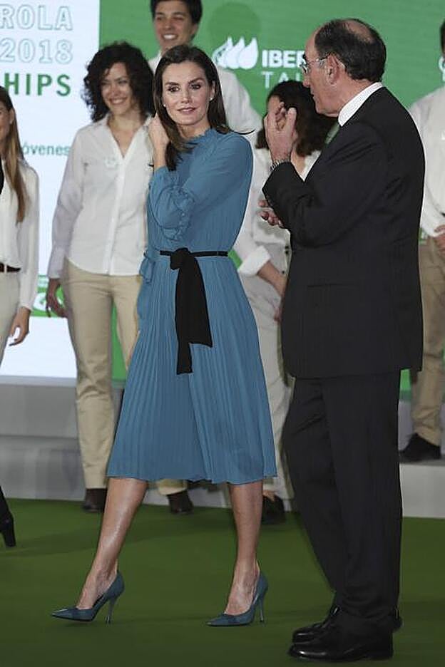 Doña Letizia aparecía con un estilismo que, inevitablemente, nos recordaba a este look de Rania de Jordania de hace unas semanas, cuando nos enamoró con una prenda de rebajas de Zara. Pero cuando nos fijábamos bien en nuestra Reina, nos dábamos cuenta de que no era lo que parecía, y que su supuesto vestido midi plisado en azul petróleo era en realidad un mono.