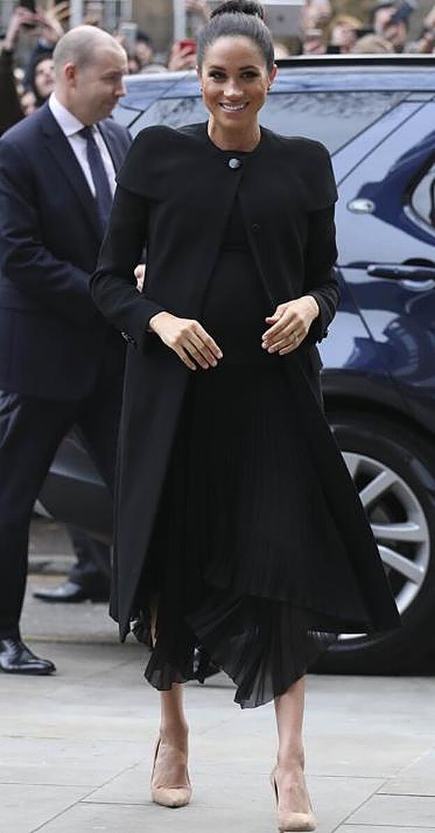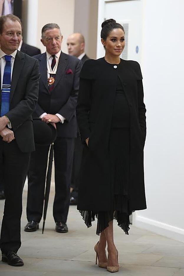 Por un lado, la Duquesa de Sussex volvió a elegir a Givenchy como firma protagonista de su look con un abrigo negro de corte masculino y hombreras marcadas que 'escondía' una delicada falda plisada combinada con un jersey negro. Así que sí, aunque Meghan 'jugó' unos días al despiste con prendas 'low cost', al más puro estilo Letizia, en esta nueva aparición vuelve a demostrar que no piensa perder su título de 'royal' que más invierte en ropa.