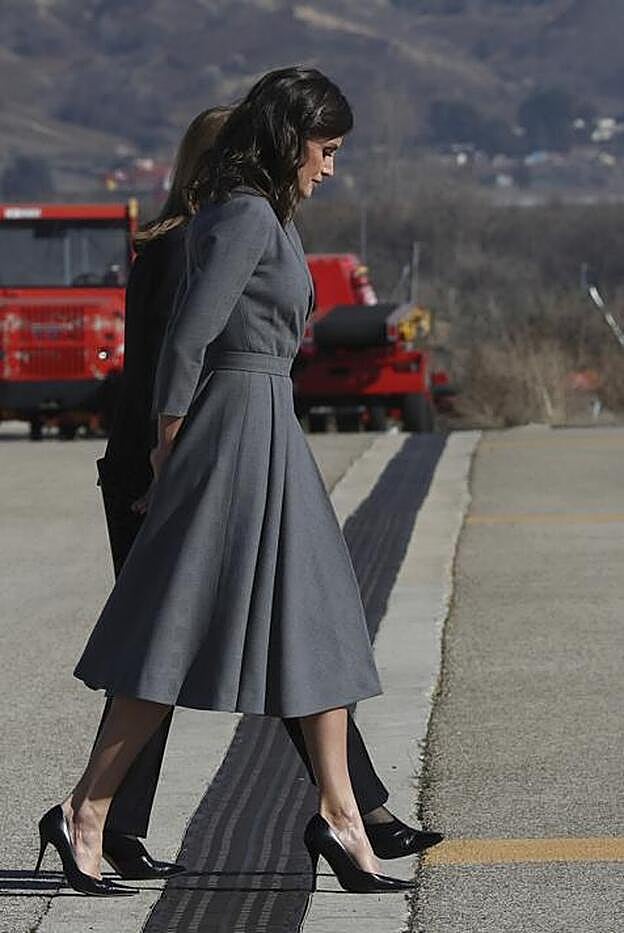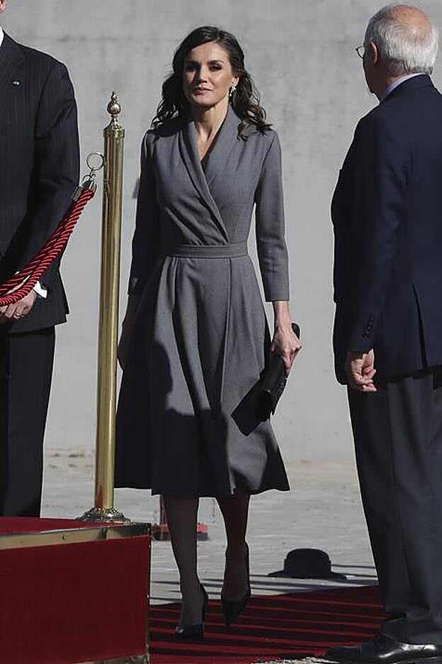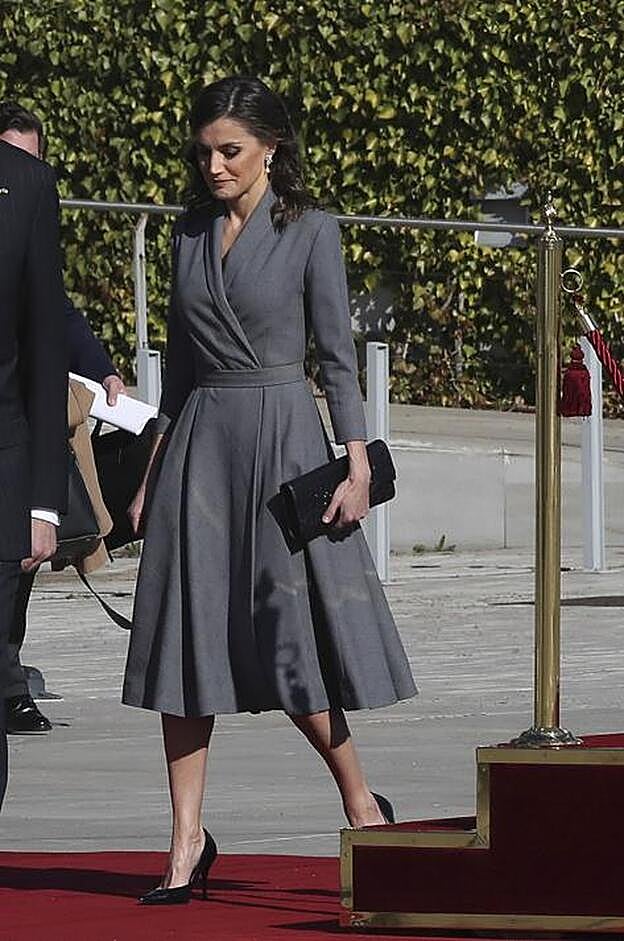 Para este viaje, doña Letizia ha apostado por la sobriedad de uno de los vestidos que más le favorecen, un diseño de inspiración retro y silueta 'lady' en gris antracita adornado con solapa esmoquin y discreto estampado de cuadros. Como apuntamos cuando lo estrenó en diciembre en el Museo Reina Sofía de Madrid, este diseño (de firma aún desconocida), tiene truco: su silueta afina la cintura y crea un efecto 'reductor' que consigue hacer más delgada.