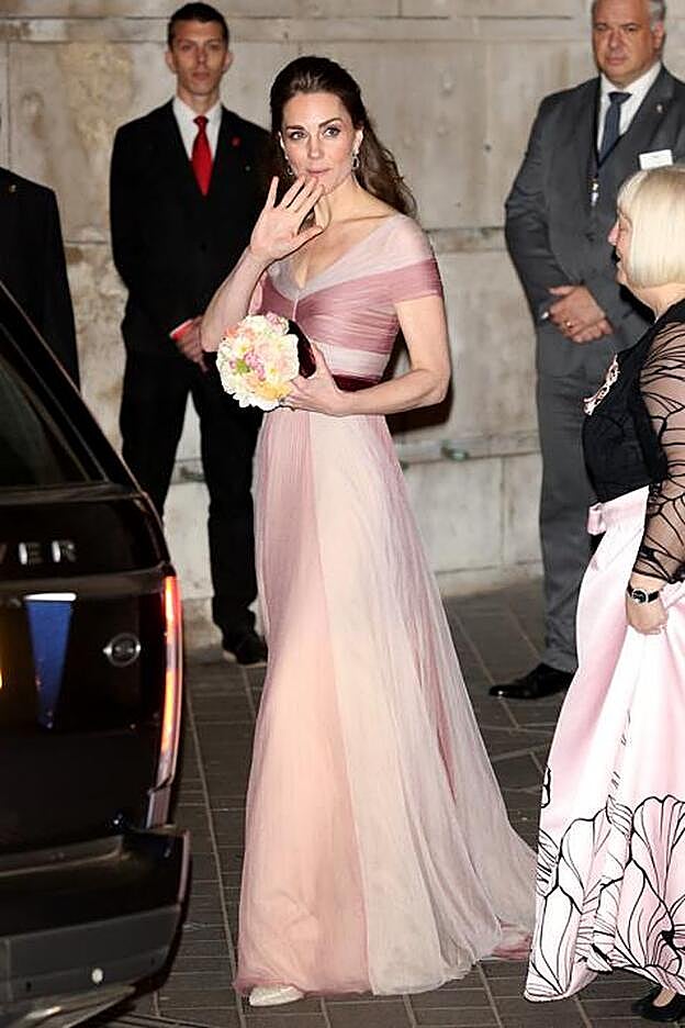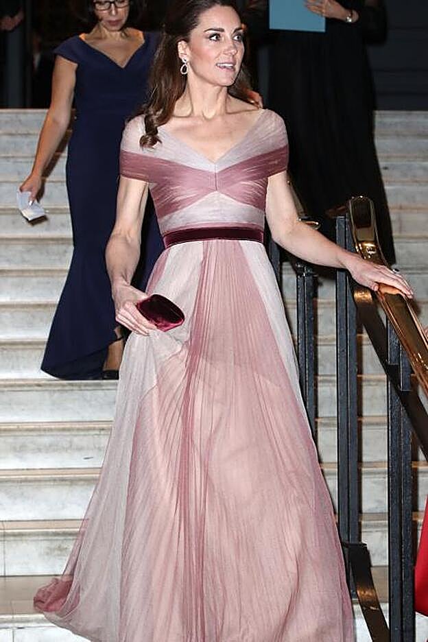 En el vestido de Kate Middleton todo funciona. Tiene la dosis justa de romanticisimo y feminidad, pero sin caer en la pompa cursi; el juego de colores maquillaje, que pasa del nude al 'blush' y llega hasta el granate, es impecable; el escote, rozando el 'off the shoulders', no puede ser más elegante y, por si fuera poco, ese cuerpo drapeado ajustado en la cintura con un lazo de terciopelo en contraste y una falda que se abre vaporosa es, probablemente, la silueta más favorecedora que existe.