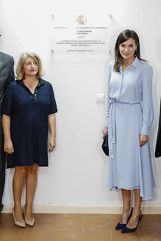 Y es que si doña Letizia aterrizó en Maputo con un vestido vaquero de Carolina Herrera muy similar a otro que había llevado hace unos meses la Duquesa de Sussex; en su almuerzo con el presidente del país y la posterior visita a la Oficina Técnica de Cooperación nuestra Reina ha apostado por un vestido camisero en azul bebé que nos recuerda muchísimo a un diseño de Verónica Beard que llevó Meghan Markle en su viaje a Tonga en octubre del año pasado.