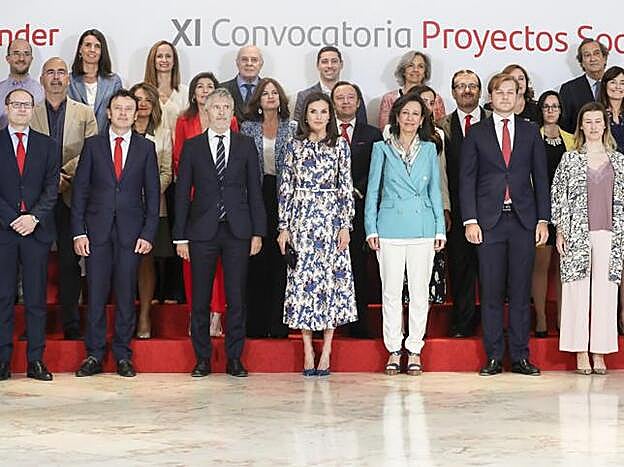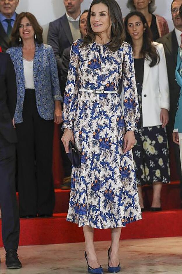La Reina no tiene miedo a los estampados, y en los últimos meses la hemos visto sumarse a todos los 'print' tendencia. Vestidos de lunares y 'animal print', rayas marineras, estampado paisley y étnicos de inspiración boho, flores primaverales en tonos 'soft' y cuadros Príncipe de Gales, su favorito para el otoño-invierno, llenan su armario. Pero esta vez, doña Letizia ha arriesgado aún más, y ha ganado, con un original vestido midi que ha estrenado en la 11ª Convocatoria de los Proyectos Sociales de Banco Santander.