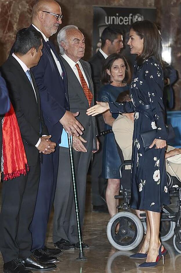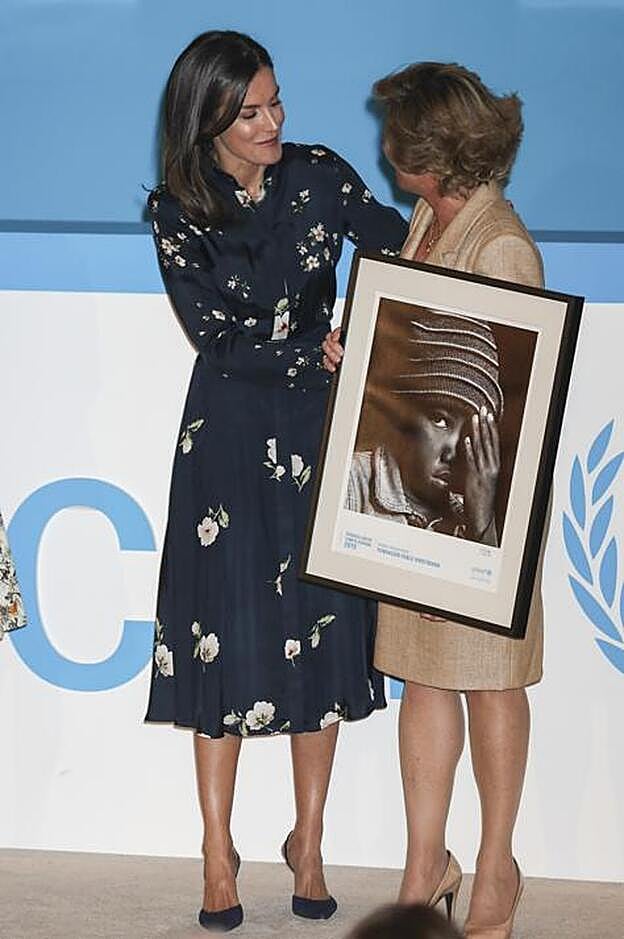 En esta ocasión, eso sí, la Reina ha apostado por el 'total blue' y ha combinado su vestido camisero midi con estampado de flores de Massimo Dutti (estuvo rebajado de 99.90 a 69.99 euros y, claro, se agotó en días) con sus salones destalonados 'navy' de Carolina Herrera (sí, esos que tiene también en negro, beige y cámel), un clutch a juego de la misma marca, y unos pequeños pendientes dorados en forma de flor de Tous.