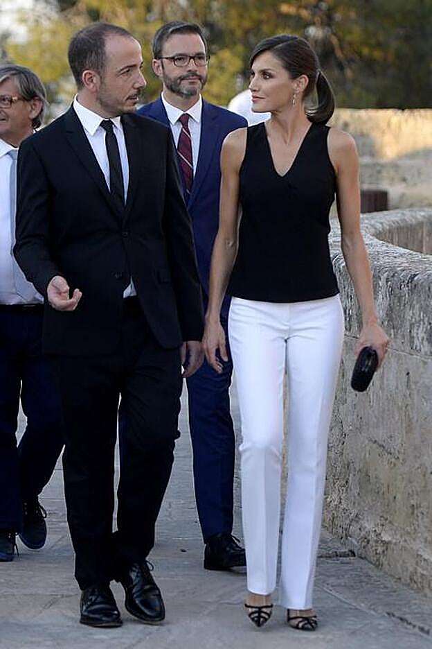 La sencillez del blanco y negro y el minimalismo de un conjunto básico formado por un top y unos pantalones rectos han sido la opción elegida por la Reina para vistar Mallorca y volver a dejar claro que, si hay una parte de su cuerpo de la que le gusta 'presumir', esa son sus brazos bien tonificados.