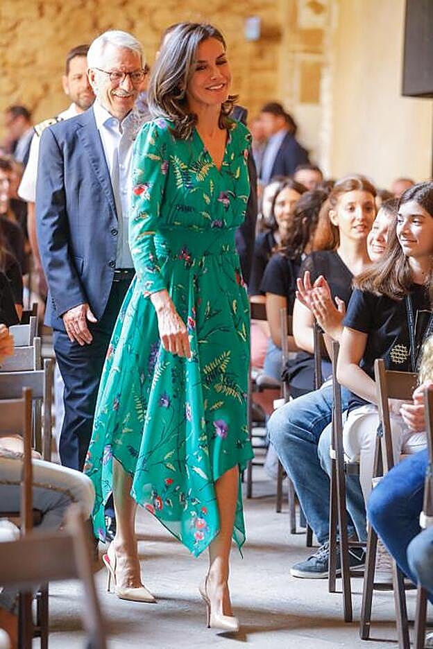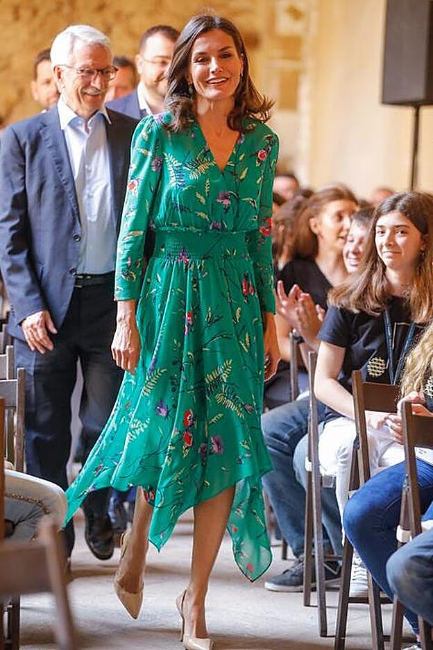 El nuevo vestido de la Reina, con manga tres cuartos, es perfecto para el clima del norte (a media mañana, en Oviedo, rondaban los 24 grados), su color verde hierba con estampado vegetal es súper favorecedor y, además, su elástico en la cintura sigue la línea de estilo que ha marcado doña Letizia esta temporada: presumir de silueta con sus vestidos de verano.