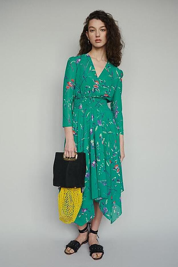 Doña Letizia ha estrenado un original vestido de gasa estampada con bajo asimétrico y escote en uve cruzado de la firma francesa Maje, un diseño que aún está disponible en rebajas en algunas tallas y que pasa de 220 a 180 euros.